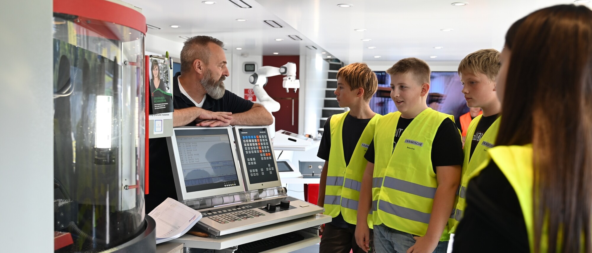 Auf den insgesamt 80 m² steht der Spaß am „selbst erleben“ im Vordergrund. Das gelingt mit anschaulichen Mitmachstationen wie dem kollaborativ arbeitenden Roboter Cobot, einer CNC-Maschine, an der die Schüler:innen ein Werkstück fräsen, oder einem Multitouchtable, an dem sie an der Produktion eines Autos mitwirken können. Auf einem großen Monitor gibt der BerufeScout außerdem Infos zu den Berufen der Metall- und Elektro-Industrie. Wer noch nicht weiß, welcher Beruf zu ihm passt, kann das hier spielerisch herausfinden – und findet auch direkt passende freie Ausbildungsplätze. Begleitet werden die Jugendlichen dabei von einem pädagogischen Beraterteam sowie von Ausbilder:innen und Auszubildenden von FRÄNKISCHE. „Ich bin beeindruckt von der Vielfältigkeit und Ausstattung, mit der den Schüler:innen die verschiedensten Berufe der modernen Industrie 4.0 vermittelt und veranschaulicht werden“, so Matthias Tusche, Ausbildungsleiter bei FRÄNKISCHE. Abgerundet wird die Berufsorientierung mit einer Besichtigung des FRÄNKISCHE-Ausbildungszentrums.