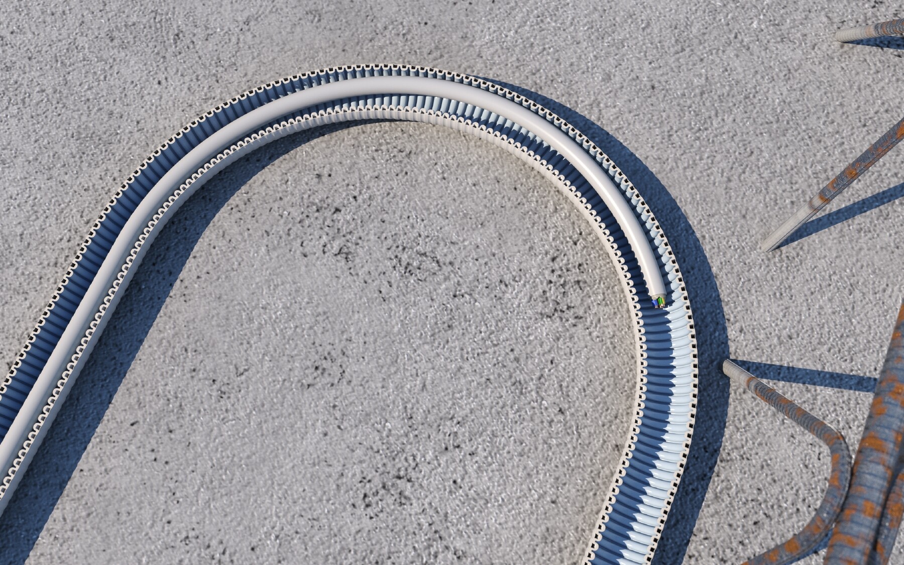 Den Anforderungen an das Qualitätssiegel entspricht das mittlere Kunststoff-Wellrohr FFKuS-EM-F Highspeed. Durch die hochgleitfähige Innenschicht können Leitungen auch über längere Strecken von bis zu 50 Metern eingezogen werden. Außerdem ist das biegsame PVC-Rohr tritt- sowie rüttelfest. Die speziell gestaltete Außenhaut verhindert zu kleine Biegeradien und schützt das Rohr vor Beschädigungen und eindringender Betonmilch. Ein Plus für die Installation: Nach dem Abrollen legt sich das FFKuS-Rohr gerade aus und schnallt nicht zurück.